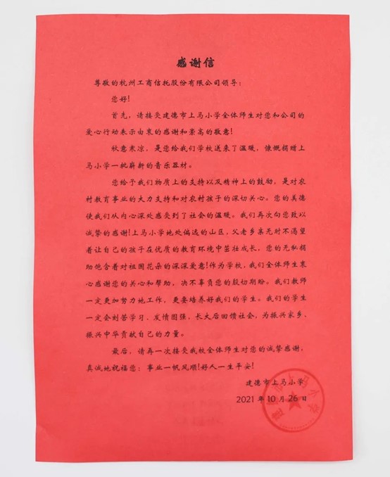 在城市的流光溢彩里,我們守著愛心;在鄉(xiāng)村匱乏的音符里,他們等著關(guān)懷。幫助邊遠山區(qū)的學校改善教學環(huán)境,配置更新必要的教學設(shè)施,是杭州工商信托多年來持續(xù)開展的公益項目。未來,公司將積極響應(yīng)“發(fā)展慈善信托、助力共同富裕”行動號召,持續(xù)以服務(wù)美好生活為己任,充分發(fā)揮金融企業(yè)的專業(yè)優(yōu)勢,助力山區(qū)教育。