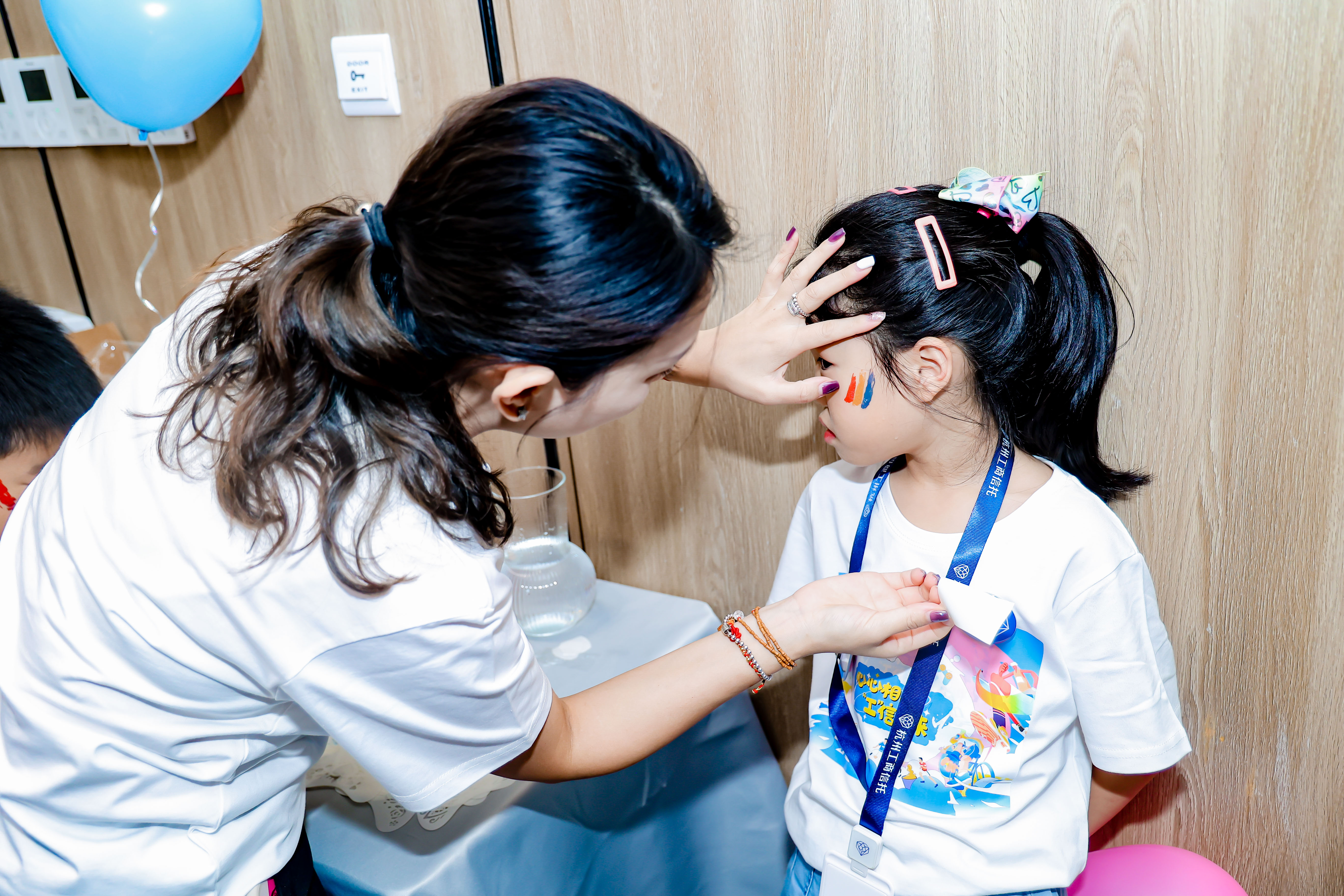 如果童年有顏色,那一定是五彩的。簽到臺(tái)前,兒童面部彩繪活動(dòng)剛剛開始,小朋友們就被各種別致新穎的彩繪圖案迷住了?!安世L師們”根據(jù)小朋友們的喜好和想象力設(shè)計(jì)并彩繪了獨(dú)一無二的圖案,孩子們的臉上綻放著燦爛的笑容,興奮地與爸爸媽媽們拍照留念。